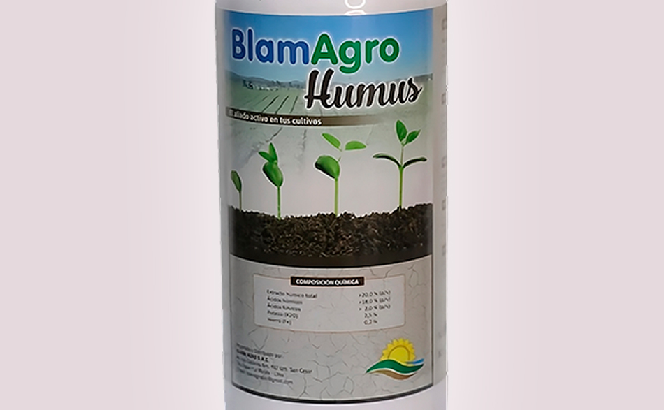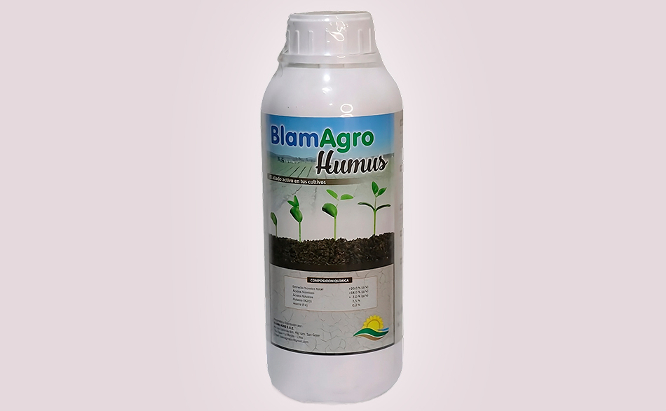BlamAgro Humus, es una suspensión de humato de potasio con un contenido mayor de 20% entre ácidos húmicos bio-activo y ácidos fúlvicos el producto se consigue en una extracción alcalina delignitos alemanes oxidados (conocidos como leonardita) tiene un alto contenido de ácido húmicos, fúlvicos y oligoelementos biológicamente activos.