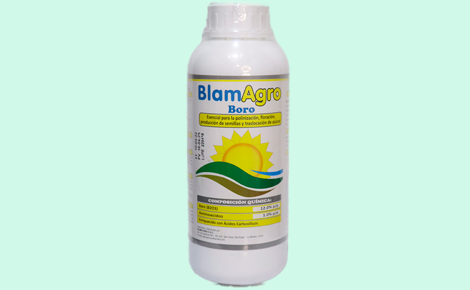 BlamAgro Boro, es un fertilizante a base de Boro acomplejado con etanolamina, que es un compuesto orgánico que permite mejorar la solubilidad, absorción y movilidad del Boro en la planta. El producto está enriquecido con aminoácidos, los cuales mejoran el transporte de azúcares a través de las membranas y estimulan el crecimiento de los meristemas apicales.