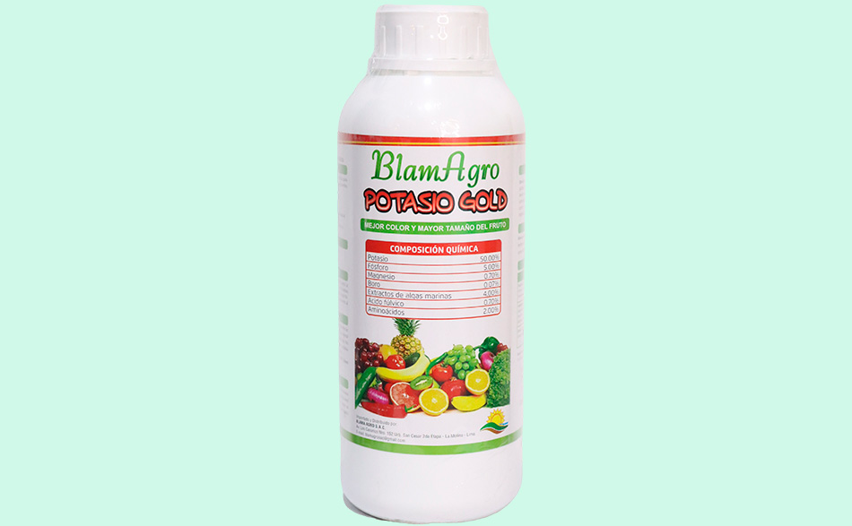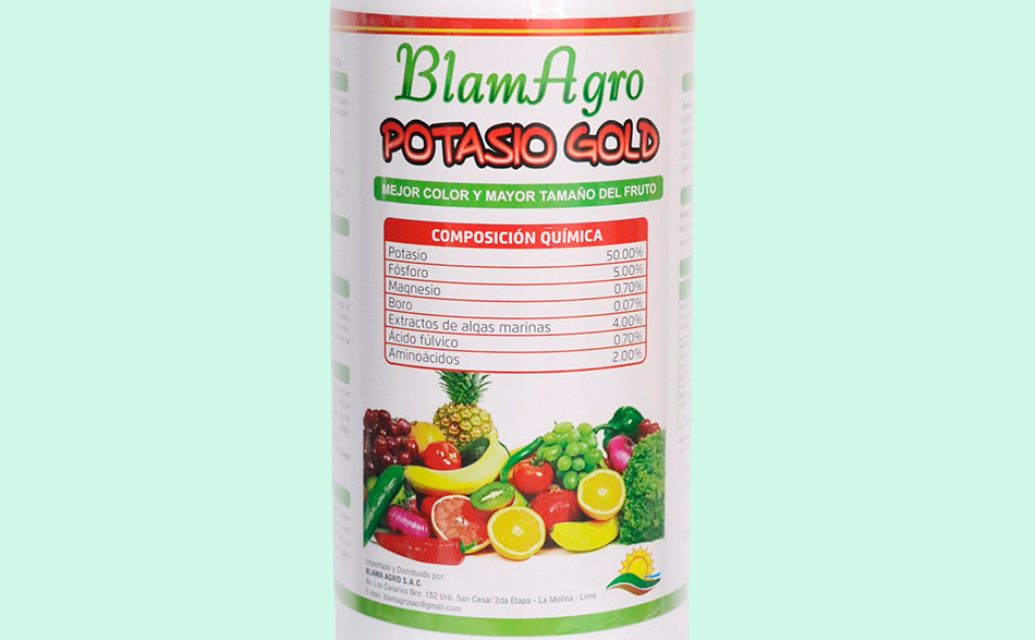 BlamAgro Potasio Gold, es un nutriente órgano mineral con alto contenido de potasio, 100% activado orgánicamente por ácidos fúlvicos, debido a su avanzada y compleja formulación permite, además contiene una alta concentración de elementos mayores, tanto primarios como secundarios, así como de elementos menores, los que se encuentran quelatados orgánicamente, permitiendo la rápida y total asimilación de los mismos.