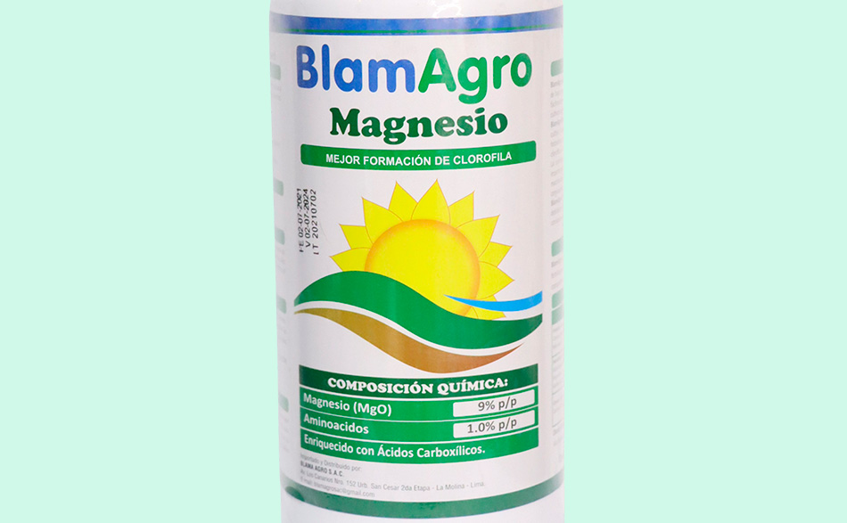 BlamAgro Magnesio, es un producto formulado con magnesio, ácidos carboxílicos de bajo peso molecular y aminoácidos, que aporta ala planta de manera muy fácilmente asimilable el magnesio necesario para suplir los requerimientos de los cultivos en procesos metabólicos básicos.